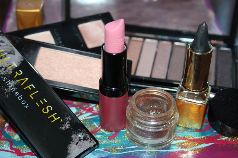 Pomieszałam podkład FM Second Skin z Revlon Color Stay, utrwaliłam je pudrem prasowanym Catrice All Matt. Na policzkach mam trochę różu 75 Inglot. Z palety UltraFlesh użyłam brzoskwiniowego różu oraz złotego rozświetlacza.
